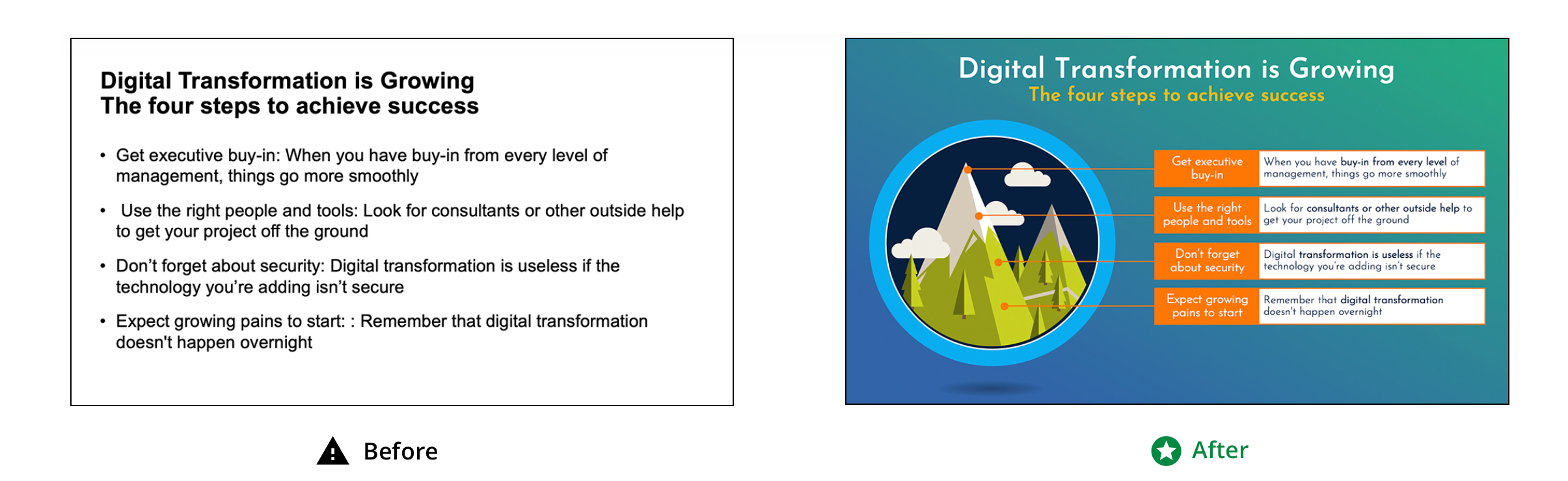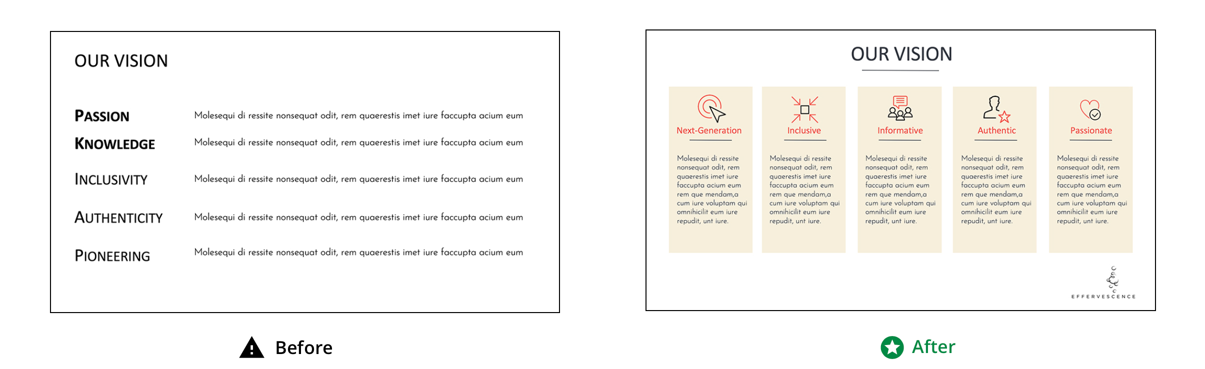 Using the supplied content, slides will be reimagined to give them a unique design.