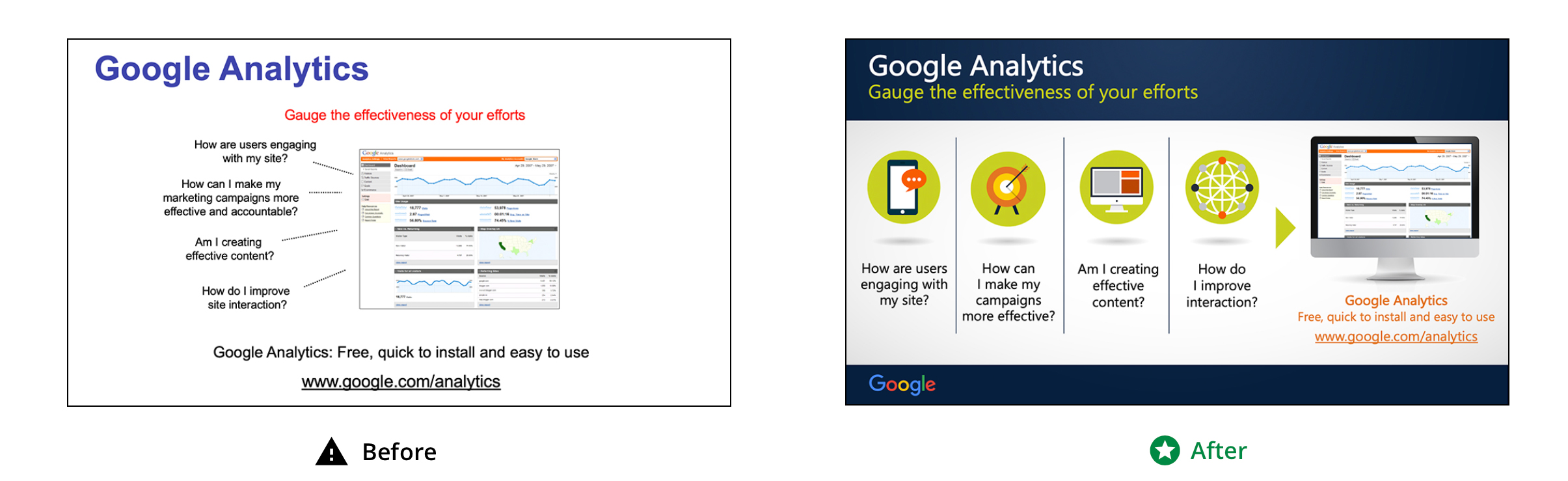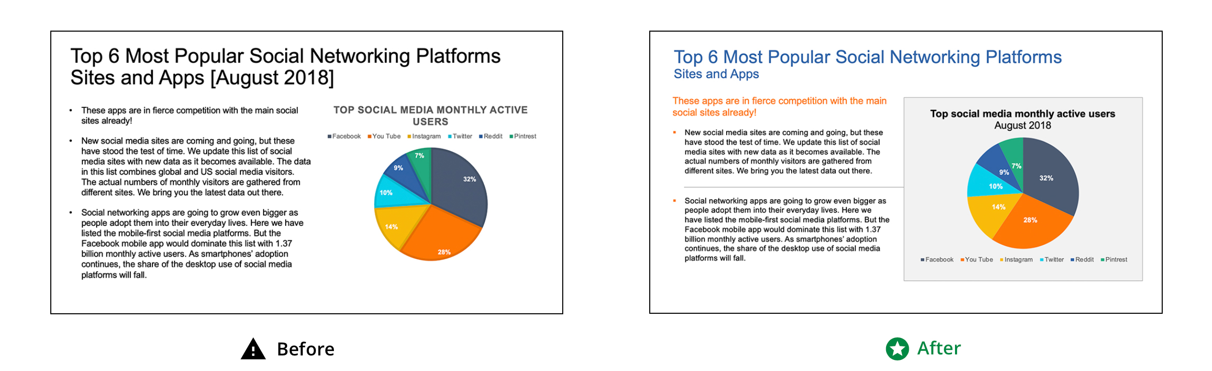 Cleaning up supplied slides and making them easier to read using color, alignment and text hierarchy.